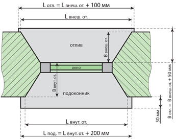 При замене или установке новых окон, как правило, в едином пакете монтируют отливы и подоконники. Чтобы определить длину необходимого для их изготовления полотна, достаточно замерить ширину проема по внешней и внутренней кромке, а затем прибавить 4-10 см. Дополнительные 4-10 см нужны для создания так называемых «ушек» или заступов отлива и подоконника за периметр проема. «Ушки» препятствуют проникновению влаги в слой теплоизолятора, продлевая срок надежной службы оконной конструкции.