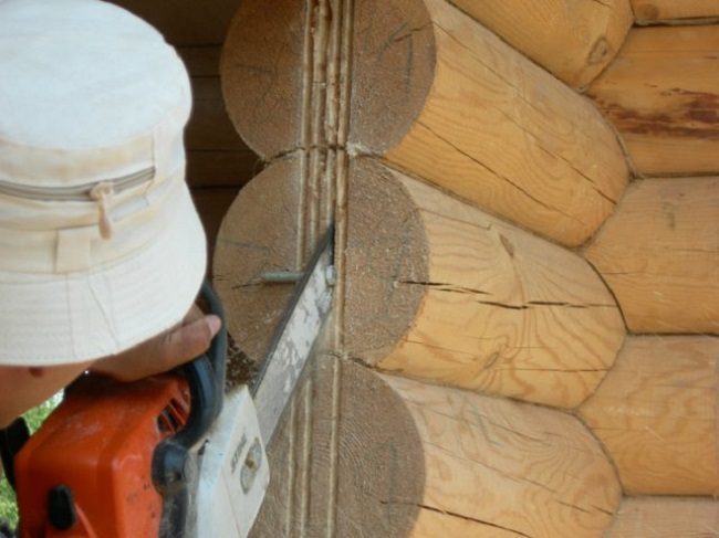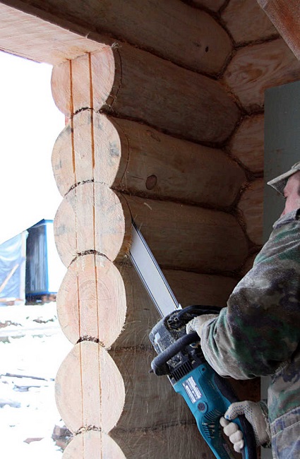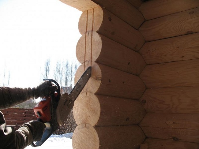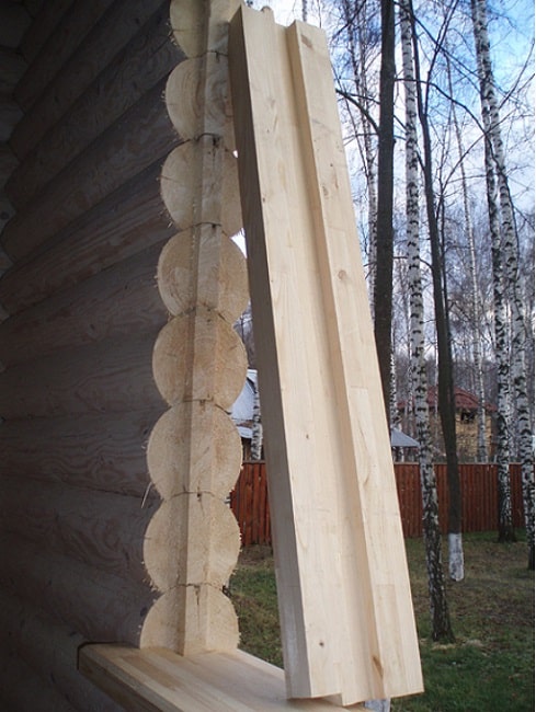 - В зависимости от выбранного типа обсады на боковых торцах оконного проема вырезают пазы или шипы. Для этого используется бензопила или циркулярная пила.