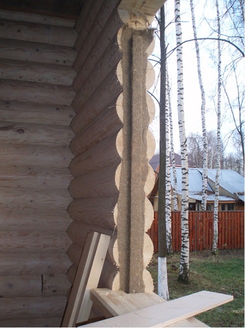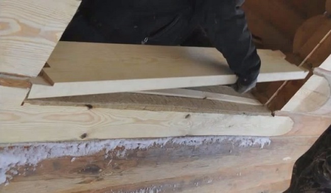 Используется тот же утеплитель, который прокладывался между венцами сруба – джут, льноватин. Его лист лучше приклеить по месту, чтобы утеплитель не сдвигался при проведении дальнейших монтажных работ.