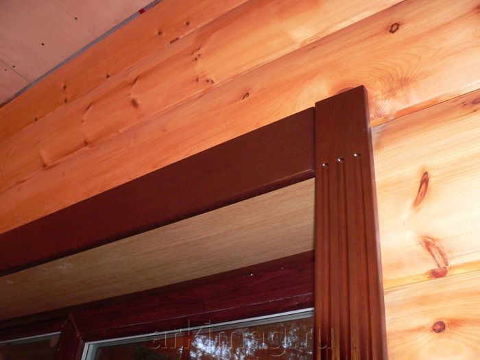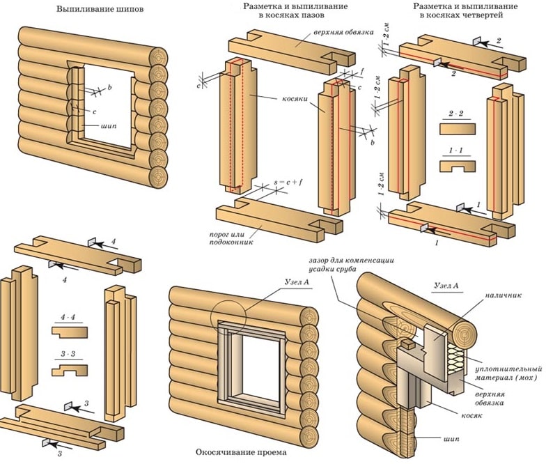 Сверху оставляем зазор на усадку 5 см. Это делается из расчета с запасом – в целом дом усядет на 10-12 см, а над оконным проемом находится около трети венцов сруба. Не забываем, что боковины шипами на 20-30 мм войдут в замки навершия и подоконника. В получаемый внутренний периметр обсады рама окна ПВХ должна «вписаться» с учетом ширины монтажного шва до 4 см снизу и сверху и до 2 см по бокам. Не забудьте, конечно, и о высоте подставочного профиля пластикового окна, который рекомендуется использовать.