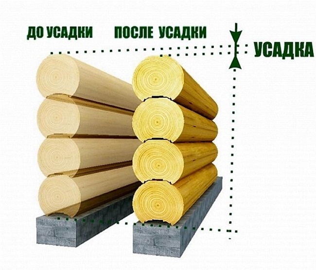 Одноэтажный деревянный дом под собственным весом усаживается по вертикали на 10-12 см за первый год. На этом интенсивный процесс заканчивается, но изменение размеров деревянных элементов продолжается ещё 10 и больше лет. Кроме усадки по вертикали, бревна в срубе может «повести» по горизонтали, ведь при усыхании возникают силы скручивания. По углам дома бревна скреплены замками и не дают друг другу деформироваться, однако по краям оконного проема сила взаимного скрепления ослаблена.