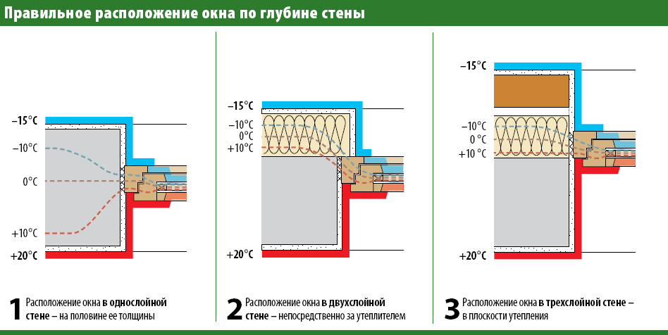 Окно всегда устанавливают в теплой зоне – тогда откосы не промерзнут, на них не будет появляться конденсат.