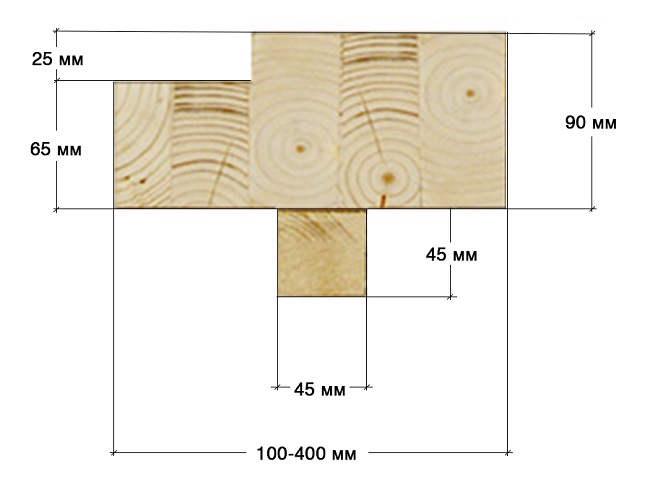 Для изготовления элементов окосячки используется только качественная сухая древесина. В сушильной камере она проходит этап усушки и дальнейшим деформациям не подвержена. На рисунке показано типичное сечение бокового элемента обсады, а верхний и нижний отличаются тем, что не имеют шипа квадратного сечения со стороной 45-50 мм.