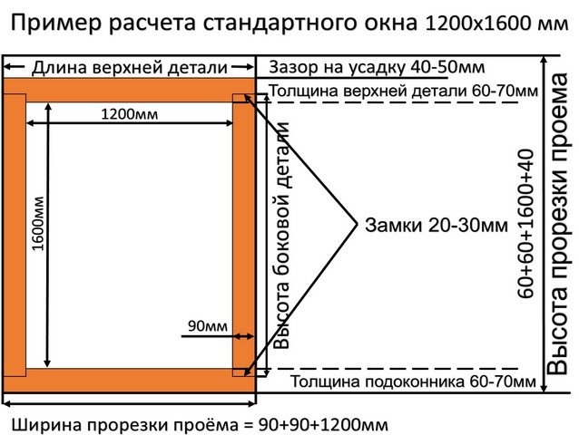 Понять, как ставить пластиковые окна в деревянном доме, как определять размеры элементов, проще на примере расчета для стандартного случая: