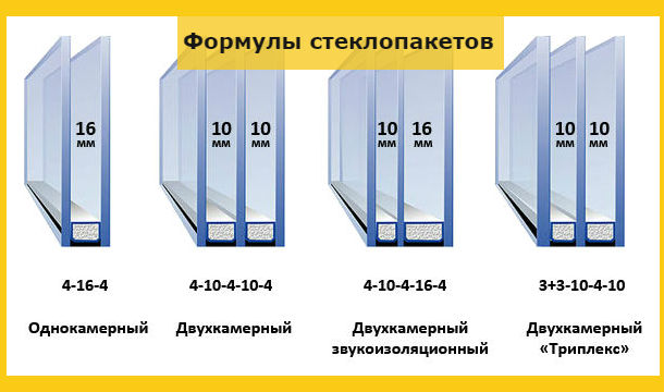 Как показано на рисунке, используется ряд формул стеклопакетов. Очевидно, что увеличение ширины камер, толщины стекол снижает теплопроводность. Но пластиковое окно решает и другие задачи, например, защиты от внешнего шума. Для повышения шумозащищенности используются такие конструктивные решения, как изготовление стеклопакетов со стеклами-триплексами, с различающейся шириной камер.