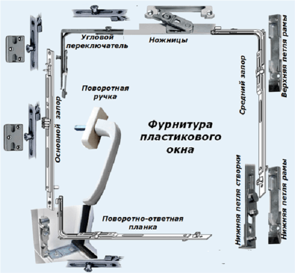 Это набор элементов, которые составляют механизм пластикового окна, позволяют фиксировать в определенных положениях, открывать и закрывать створки. Внешними видимыми и используемыми жильцами элементами этого механизма выступают поворотные ручки, другую часть системы внешний наблюдатель видит при открывании створок. Описывать, как называются детали фурнитуры пластиковых окон, не будем, поскольку они приведены на рисунке.